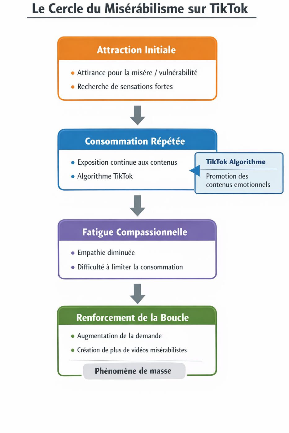 Résumons : nous sommes naturellement attirés par les vidéos mettant de l’avant une certaine misérabilité, soit parce que nous nous comparons, soit parce que nous aimons les sensations fortes. Après avoir consommé plusieurs contenus du genre — mis de l’avant par l’algorithme TikTok — nous développerions une fatigue compassionnelle, qui nous empêcherait d’adopter des habitudes morales vis-à-vis de ces contenus. Ainsi, un réel phénomène de masse se créerait et encouragerait la production de TikTok similaires.